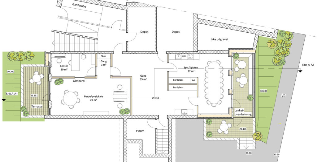 For at forbedre dagslysforholdene og mindske kælderfornemmelsen tilfører vi udsyn, og derved sikres flugtveje også via de to terrasser.
