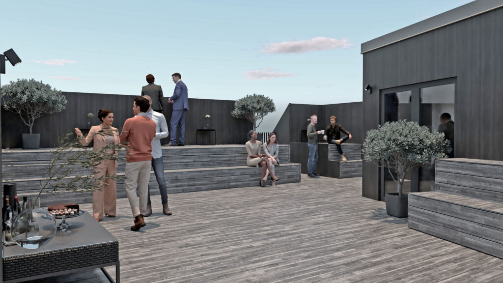 Et stort lyst caféområde med plantevæg og gulvbassin ligger til flot udsigt fra 1. salens balkoner. En tagterrasse er ligeledes en del af tilbygningen med adgang via teknik og trappekerne.